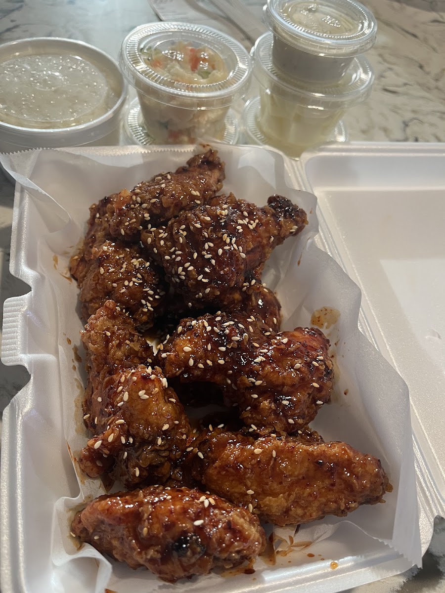 BE SURE TO UNDERSTAND THAT THIS ISN'T A SIT DOWN RESTAURANT BEFORE ORDERING I was craving Korean fried chicken wings but wasn't sure if there were good places near me. Ordered online, got my time slot, and drove over. As soon as I pulled up, I got a text saying the wings would be a couple minutes, so big ups for clear and friendly communication Got my wings and bulgogi fries and BOI lemme TELL you. They weren't lying when they said the wings are "Super Crispy, Never Greasy!" Super flavorful, super juicy wings, incredibly good fries. No complaints! It even came with a glove and a free side of potato salad 6 out of 5 stars for the food, communication, and vibes. Definitely recommend if you're in the area and want some Korean fried chicken wings.
